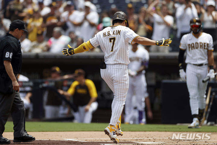 [샌디에이고=AP/뉴시스] 샌디에이고 파드리스의 김하성이 19일(현지시각) 미 캘리포니아주 샌디에이고의 펫코 파크에서 열린 2023 메이저리그 애리조나 다이아몬드백스와의 연속 경기 1차전 1회 말 1점 홈런(시즌 16호)을 친 후 홈에 들어오며 세리머니하고 있다. 김하성은 5타수 1안타 1삼진을 기록했고 팀은 4-6으로 패했다. 2023.08.20.