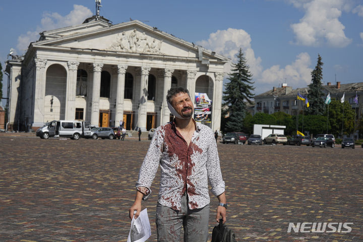 [체르느히우=AP/뉴시스] 19일(현지시간) 우크라이나 북부 체르느히우의 크라스나 광장에서 러시아군의 미사일 공격으로 부상한 남성이 피투성이가 된 채 걸어 나오고 있다. 뒤편에는 공습으로 파손된 타라스 셰우첸코 극장이 보인다. 러시아군의 미사일이 체르느히우 도심을 강타해 최소 7명이 숨지고 129명이 다친 것으로 집계됐다. 2023.08.20.