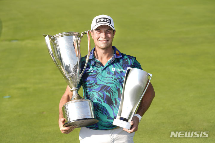 [올림피아필즈=AP/뉴시스] 빅토르 호블란(노르웨이)이 20일(현지시각) 미 일리노이주 올림피아필즈의 올림피아필즈 CC에서 열린 미국프로골프(PGA) 투어 페덱스컵 플레이오프 2차전 BMW 챔피언십 정상에 올라 우승컵(오른쪽)과 웨스턴골프협회 트로피를 들고 포즈를 취하고 있다. 호블란은 최종 합계 17언더파 263타로 우승, 시즌 2승(PGA 통산 5승)을 기록했다. 2023.08.21.