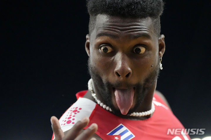 [부다페스트=AP/뉴시스] 크리스티안 나폴레스(쿠바)가 21일(현지시각) 헝가리 부다페스트에서 열린 2023 세계육상선수권대회 남자 세단뛰기 결선에서 동메달을 딴 후 익살스러운 표정을 짓고 있다. 2023.08.22.