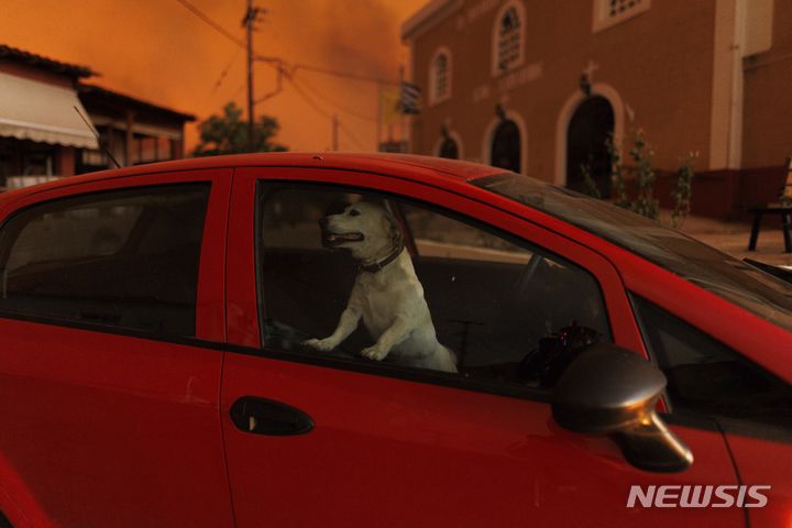 [알렉산드루폴리스=AP/뉴시스] 21일(현지시각) 그리스 에브로스주 알렉산드루폴리스 인근에서 발생한 산불이 아반타스 마을로 번지는 동안 개 한 마리가 차 안에 앉아 있다. 덥고 건조한 날씨 속 강풍으로 불길이 거세게 확산해 인근 마을 주민들이 대피하고 고속도로 일부가 폐쇄됐으며 주택과 교회 등이 불에 탔다. 2023.08.22.