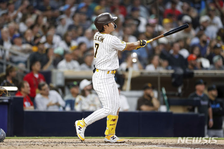 [샌디에이고=AP/뉴시스] 샌디에이고 파드리스의 김하성이 21일(현지시각) 미 캘리포니아주 샌디에이고의 펫코 파크에서 열린 2023 메이저리그 마이애미 말린스와의 경기 2회 말 만루홈런을 치고 있다. 2023.08.22.