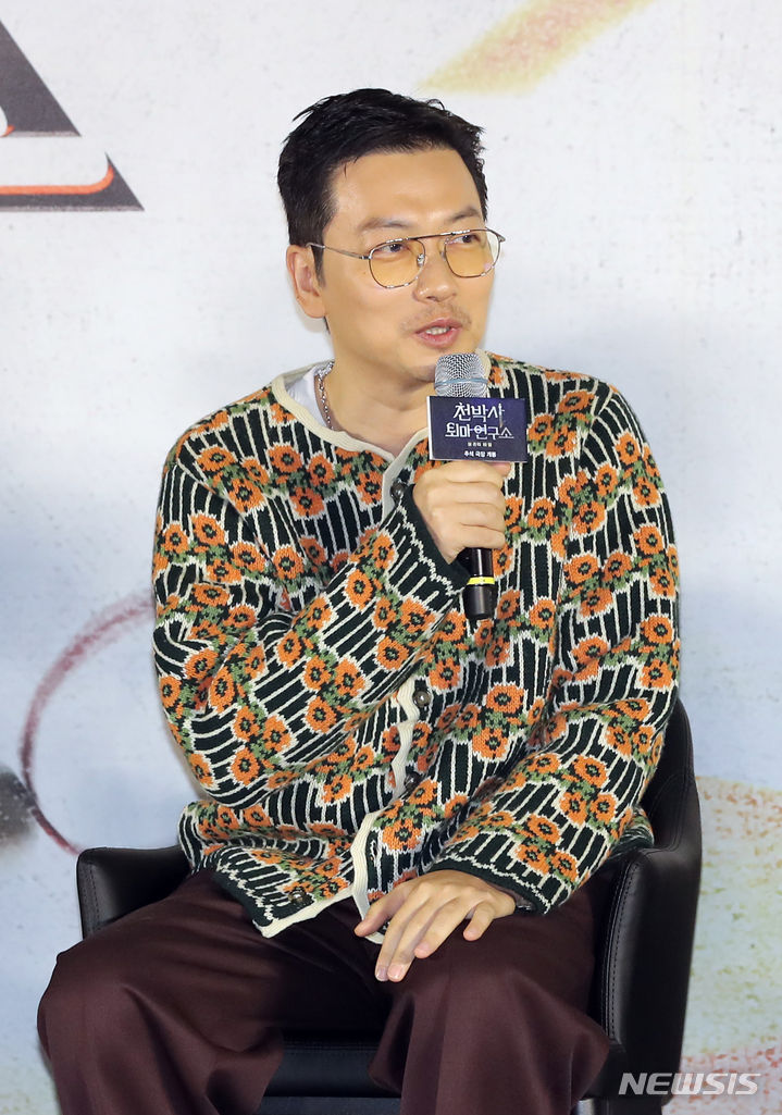 [서울=뉴시스] 김금보 기자 = 배우 이동휘가 22일 서울 용산구 CGV용산아이파크몰에서 열린 '천박사 퇴마 연구소: 설경의 비밀' 제작보고회에서 질문에 답하고 있다. 2023.08.22. [email protected]