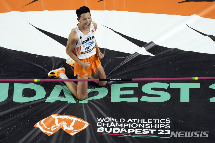 [부다페스트=AP/뉴시스] 우상혁이 22일(현지시각) 헝가리 부다페스트 국립육상경기장에서 열린 2023 세계육상선수권대회 남자 높이뛰기 결선에서 바를 넘은 후 포효하고 있다. 우상혁은 최종 2m29를 넘어 6위를 기록했다. 2023.08.23.