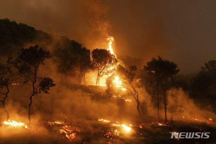 [알렉산드루폴리스=AP/뉴시스] 22일(현지시각) 그리스 에브로스주 알렉산드루폴리스 인근 디켈라 마을 숲이 불에 타고 있다. 소방 당국은 나흘째 이어진 대형산불로 사망자가 최소 20명으로 늘어났다고 밝히면서 시신 발견 지역이 튀르키예에서 그리스로 밀입국하는 경로인 점을 고려해 사망자들이 불법 이주민인 것으로 추정했다. 2023.08.23.