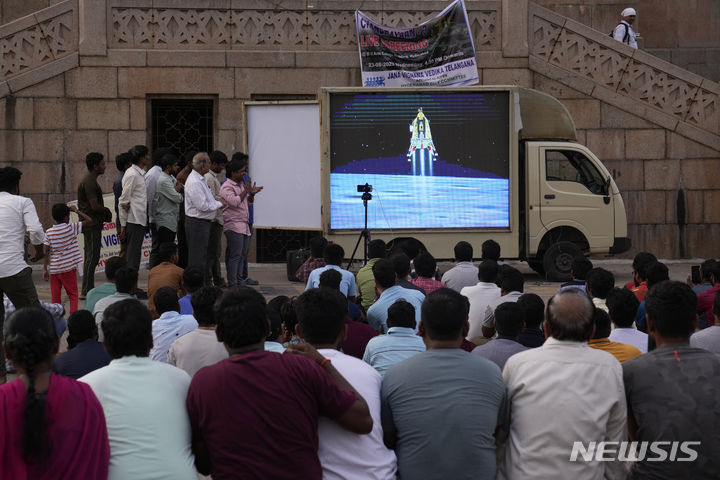 [하이데라바드=AP/뉴시스] 23일(현지시각) 인도 하이데라바드의 오마니 대학교에서 사람들이 무인 우주선 '찬드라얀 3호'의 달 착륙선 '바크람'이 달 남극 부근에 착륙하는 소식을 지켜보고 있다. 세계 최초로 달 남극 부근에 착륙한 바크람은 로봇 탐사선 '프라지얀'을 밖으로 보내 남극 부근의 물 얼음 채취에 나선다. 인도는 세계 4번째 달 착륙 국가가 됐다. 2023.08.24.