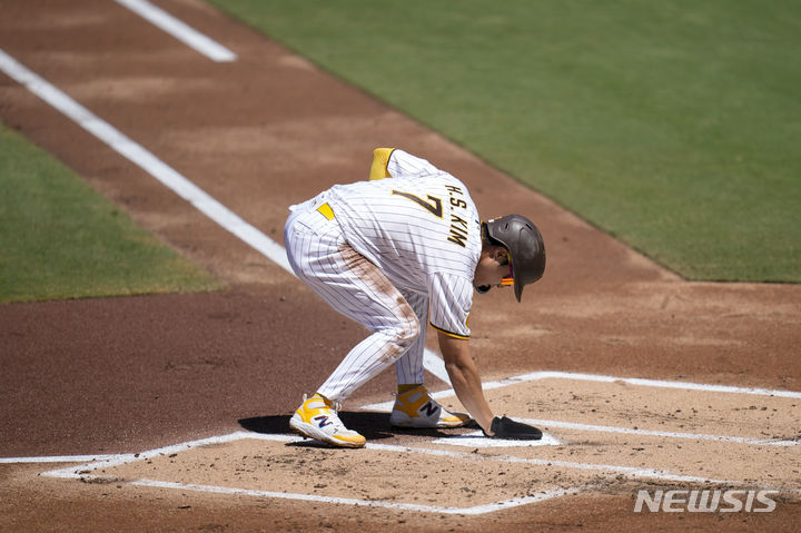 [샌디에이고=AP/뉴시스] 샌디에이고 파드리스의 김하성이 23일(현지시각) 미 캘리포니아주 샌디에이고의 펫코 파크에서 열린 2023 메이저리그 마이애미 말린스와의 경기 1회 말 2루타로 진루한 후 후안 소토의 적시타로 득점하면서 손으로 홈 플레이트를 터치하고 있다. 김하성은 4타수 1안타 1득점을 기록했고 팀은 4-0으로 완승했다. 2023.08.24.