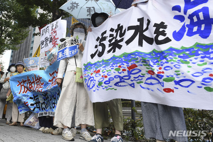 [도쿄=AP/뉴시스] 24일 일본 도쿄의 도쿄전력 본사 앞에서 시위대가 "오염수 해양 방류 반대"라고 쓰인 팻말을 들고 시위하고 있다. 일본 정부와 도쿄전력은 24일 오후 1시부터 후쿠시마 제1원자력발전소 오염수의 해양 방류를 시작한다. 2023.08.24.