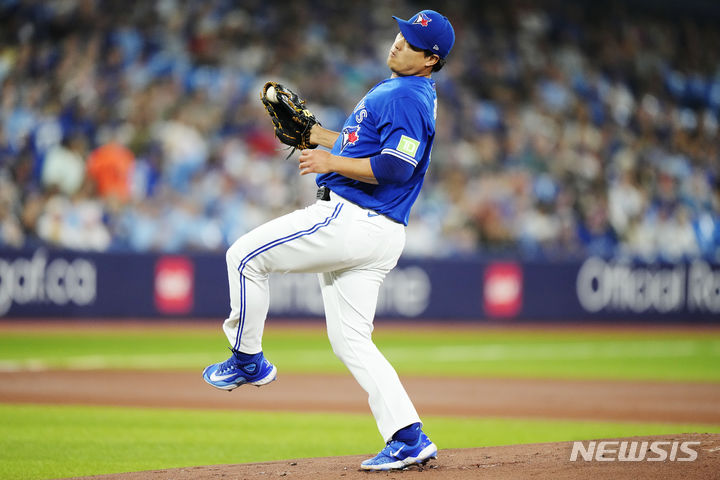 [토론토=AP/뉴시스] 토론토 블루제이스의 류현진이 26일(현지시각) 캐나다 온타리오주 토론토의 로저스센터에서 열린 2023 메이저리그(MLB) 클리블랜드 가디언스와의 경기 1회 초 콜 칼훈의 땅볼을 처리하고 있다. 류현진은 5이닝 4피안타(2홈런) 3실점(2자책점)을 기록했고 팀은 8-3으로 승리해 시즌 3승을 거뒀다. 2023.08.27.