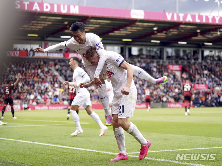 [본머스=AP/뉴시스] 토트넘 홋스퍼의 손흥민(위)이 26일(현지시각) 영국 본머스의 바이탈리티 스타디움에서 열린 본머스와의 2023~24 잉글랜드 프리미어리그(EPL) 3라운드 후반 18분 데얀 쿨루셉스키의 골을 축하하고 있다. 손흥민은 공격 포인트는 없었으나 팀플레이에 집중하며 팀의 2-0 승리를 이끌었다. 2023.08.27.