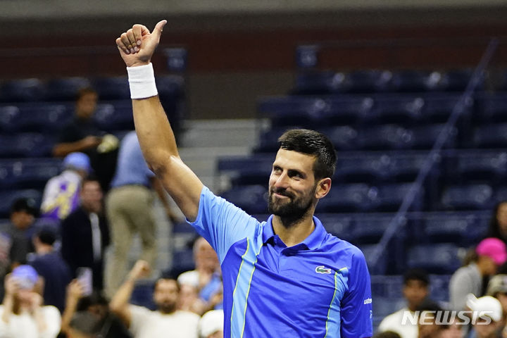 [뉴욕=AP/뉴시스] 노바크 조코비치(2위·세르비아)가 28일(현지시각) 미국 뉴욕에서 열린 US오픈 남자 단식 1회전에서 알렉상드르 뮐러(84위·프랑스)를 물리친 후 관중에 인사하고 있다. 조코비치가 3-0(6-0 6-2 6-3)으로 완승하고 2회전에 올랐다. 2023.08.29.