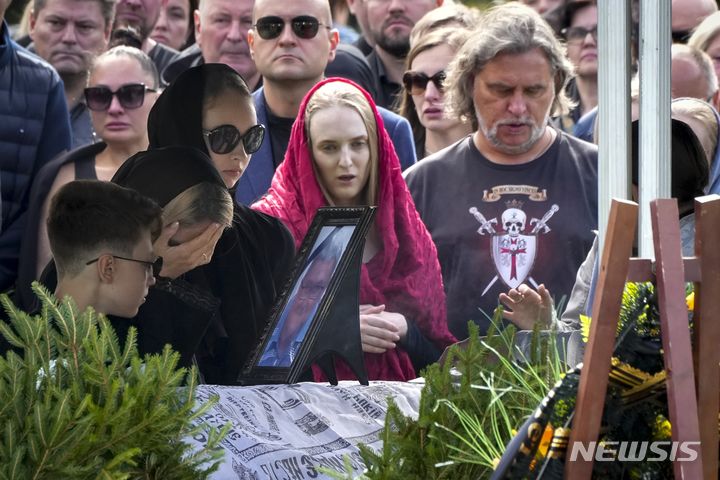 [상트페테르부르크=AP/뉴시스] 29일(현지시각) 러시아 상트페테르부르크의 포로홉스코예 묘지에서 바그네르 용병 그룹 수장 예브게니 프리고진의 장례식이 열려 그의 가족·친구들이 고인을 애도하고 있다. 바그네르 그룹은 성명을 통해 프리고진의 장례식이 비공개로 열렸다고 밝혔으며 그에게 작별을 고할 사람은 이곳으로 가라고 전했다. 앞서 크렘린궁은 블라디미르 푸틴 러시아 대통령이 그의 장례식에 참석하지 않을 것임을 밝혔다. 2023.08.30.