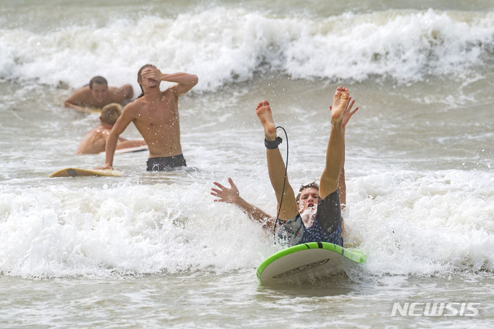 [키웨스트=AP/뉴시스] 29일(현지시각) 미 플로리다주 키웨스트 해변에서 서퍼들이 허리케인 '이달리아'로 모처럼 찾아온 파도타기의 기회를 즐기고 있다. 현지 당국은 열대성 폭풍에서 허리케인으로 강화된 이달리아의 접근에 대비할 것을 주민들에게 당부했다. 2023.08.30.