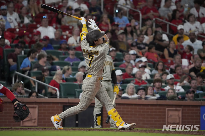 [세인트루이스=AP/뉴시스] 샌디에이고 파드리스의 김하성이 29일(현지시각) 미 미주리주 세인트루이스의 부시 스타디움에서 열린 2023 메이저리그 세인트루이스 카디널스와의 경기 8회 초 희생플라이를 치고 있다. 김하성은 3타수 2안타 1타점 1득점 1볼넷을 기록했으며 팀은 연장 끝 5-6으로 역전패했다. 2023.08.30.