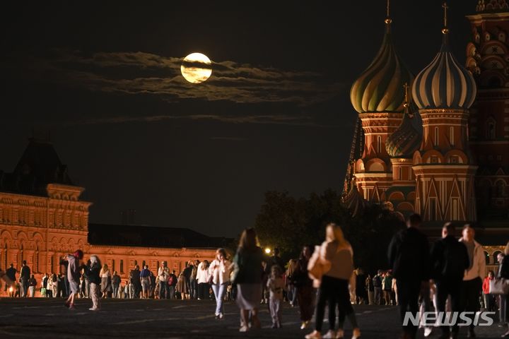 [모스크바=AP/뉴시스] 30일(현지시각) 러시아 모스크바의 성 바실리 대성당 상공에 '슈퍼 블루문'이 구름 사이에 얼굴을 내밀고 있다. 이번 보름달은 '슈퍼 블루문'으로 한달에 2번 뜨는 슈퍼문을 의미한다. 2023.08.31.