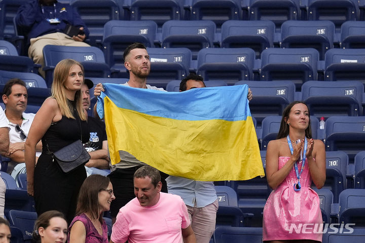 [뉴욕=AP/뉴시스] 지난달 31일(현지시각) 미국 뉴욕에서 열린 US오픈 여자 단식 2회전 엘리나 스비톨리나(26위·우크라이나)와 아나스타샤 파블류첸코바(98위·러시아)의 경기 중 팬들이 우크라이나 국기를 들고 응원하고 있다. 스비톨리나가 2-1(5-7 6-4 6-4)로 이기고 3회전에 올랐다. 2023.09.01.