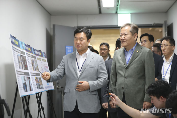 [인천공항=뉴시스] 김근수 기자 = 이상민 행정안전부 장관이 2일 오전 인천공항 제1여객터미널 공항 세관 X-ray 판독실을 방문해 현장점검을 하고 있다. 2023.09.02. [email protected]
