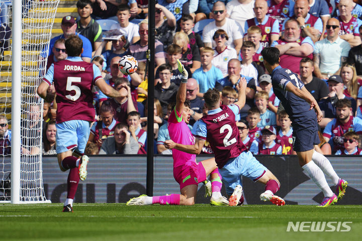 [번리=AP/뉴시스] 토트넘 홋스퍼의 손흥민(오른쪽)이 2일(현지시각) 영국 번리의 터프 무어에서 열린 번리와의 2023~24 잉글랜드 프리미어리그(EPL) 4라운드 전반 16분 동점 골을 넣고 있다. 손흥민은 해트트릭을 기록하며 팀의 5-2 승리를 이끌었다. 2023.09.03.