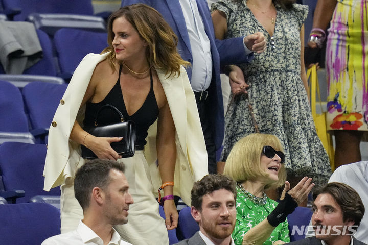 [뉴욕=AP/뉴시스] 배우 엠마 왓슨이 5일(현지시각) 미국 뉴욕에서 열린 US오픈 여자 단식 8강전 카롤리나 무호바(10위·체코)와 소라나 크르스테아(30위·루마니아)의 경기를 관람하기 위해 자리에 앉고 있다. 2023.09.06.