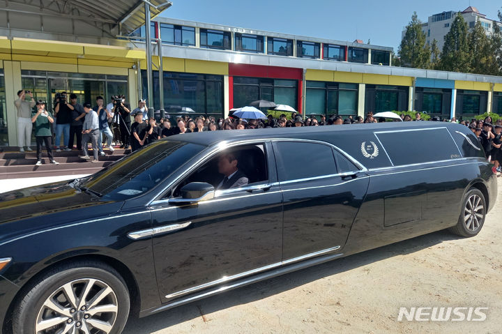 [대전=뉴시스] 유순상 기자=학부모 악성 민원 등에 시달려 극단적인 선택을 한 대전 40대 여교사 운구차량이 9일 근무하던 유성구 한 초등학교에 도착하고 있다. 2023.09.09. [email protected]