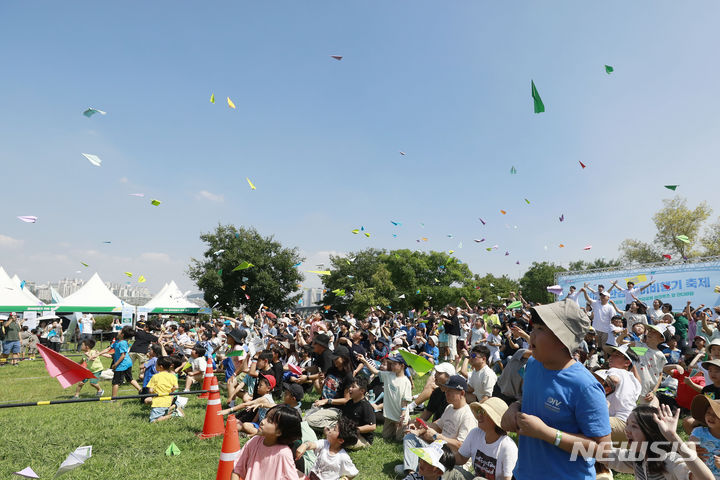 [서울=뉴시스] 최동준 기자 = 9일 서울 여의도한강공원 잔디마당에서 열린 한강 종이비행기 축제에 참가한 어린이들이 종이비행기를 하늘 위로 날리고 있다. 2023.09.09. [email protected]