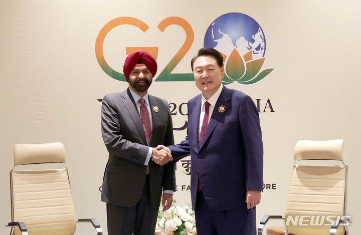 [뉴델리=뉴시스] 전신 기자 = 윤석열 대통령이 9일(현지시간) 뉴델리 바라트 만다팜 국제컨벤션센터에서 아제이 방가 세계은행 총재를 접견하고 있다. (공동취재) 2023.09.09. [email protected]