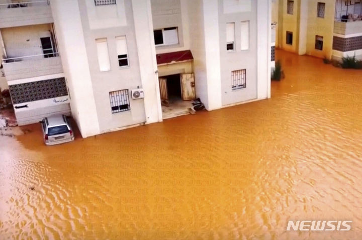 [마르지=AP/뉴시스] 리비아에 강력한 폭풍우가 상륙해 11일(현지시각) 마르지 시내가 물에 잠겨 있다. 지중해성 폭풍 '대니얼'로 리비아 동부에 홍수와 산사태가 발생해 최소 2000명이 숨진 것으로 나타났다. 2023.09.12.