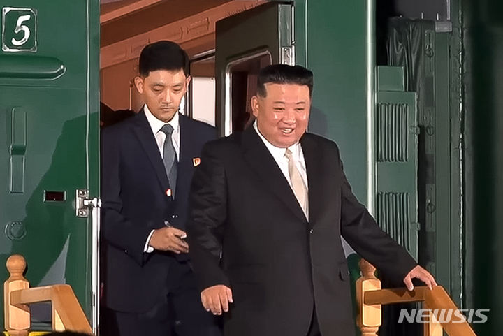 [하산(러시아)=AP/뉴시스] 블라디미르 푸틴 러시아 대통령 등을 만나기 위해 육로로 러시아로 향한 김정은 북한 국무위원장이 12일 러시아 연해주 남단 하산스키 하산역에 도착한 전용열차에서 내리는 모습이 연해주 주지사 올레그 코제먀코 텔레그램 채널 영상을 통해 공개됐다. 2023.09.12.