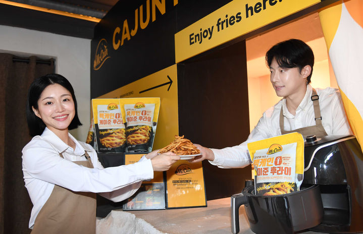 [서울=뉴시스] 14일 서울 마포구 연남동에 위치한 퀸넬브릴에서 열린 팝업 '하우스 오브 맥케인' 오픈 행사에서 모델들이 맥케인의 대표제품인 케이준 후라이를 선보이고 있다. 하우스 오브 맥케인은 감자튀김을 테마로 한 컨템포러리 아트 전시회로, 오는 23일까지 열흘간 다양한 체험 존을 운영한다. (사진=맥케인 푸드 제공) 2023.09.14. [email protected] *재판매 및 DB 금지