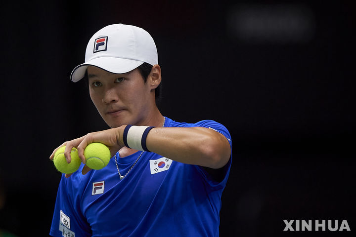 [발렌시아=신화/뉴시스] 권순우(112위)가 14일(현지시각) 스페인 발렌시아에서 열린 2023 데이비스컵 파이널 조별리그 C조 2차전 2단식 이르지 레헤츠카(30위·체코)와 경기하고 있다. 한국은 권순우가 0-2(1-6 5-7)로 패하고 1단식과 복식에서도 패해 체코에 0-3으로 지며 2패를 기록했다. 2023.09.15.