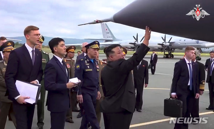 [블라디보스토크=AP/뉴시스] 러시아 국방부 공보국이 제공한 사진에 김정은 북한 국무위원장이 16일(현지시각) 블라디보스토크 국제공항에서 세르게이 쇼이구 러시아 국방장관 등과 함께 러시아 전투기들을 살펴보고 있다. 2023.09.16.