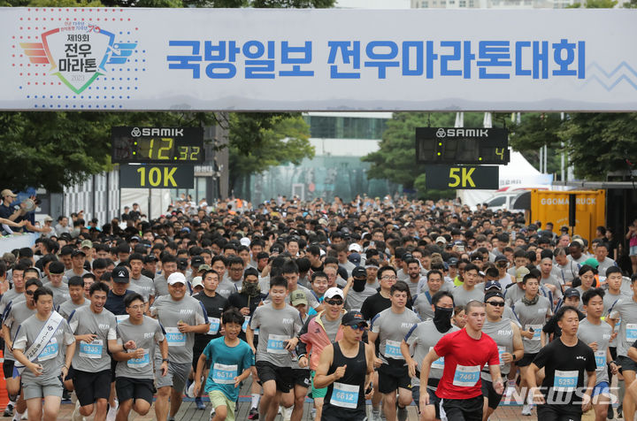 [서울=뉴시스] 김금보 기자 = 16일 오전 서울 송파구 올림픽공원 평화의광장 일대에서 열린 '건군 75주년 및 한미동맹 70주년 기념 제19회 국방일보 전우마라톤'에 참가한 국군 장병, 주한미군과 가족, 일반인 러너들이 힘차게 출발하고 있다. 2023.09.16. [email protected]