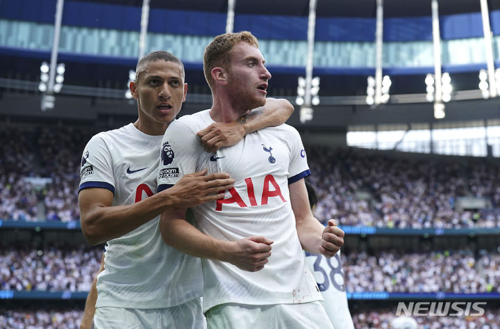 [런던=AP/뉴시스] 토트넘 홋스퍼의 데얀 쿨루셉스키(오른쪽)가 16일(현지시각) 영국 런던의  토트넘 홋스퍼 스타디움에서 열린 2023~24시즌 프리미어(EPL) 리그 5라운드 셰필드 유나이티드와의 경기 후반 추가시간 히샤를리송의 도움으로 골을 넣은 후 기뻐하고 있다. 0-1로 패색이 짙던 토트넘은 후반 추가시간 히샤를리송과 쿨루셉스키의 연속 골로 2-1 역전승을 거뒀다. 2023.09.17.