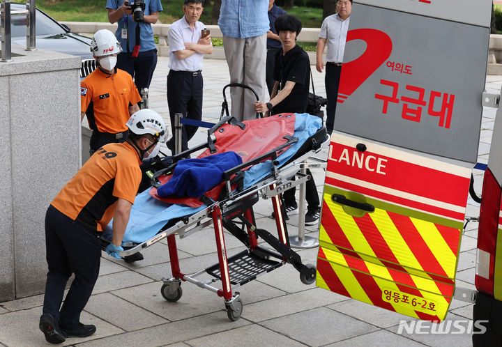 [서울=뉴시스] 추상철 기자 = 이재명 더불어민주당 대표 단식 18일차를 맞은 17일 오후 서울 여의도 국회에서 119대원들이 당 대표실로 들어갔으나 이 대표의 거부로 다시 나오고 있다. (공동취재사진) 2023.09.17. [email protected]