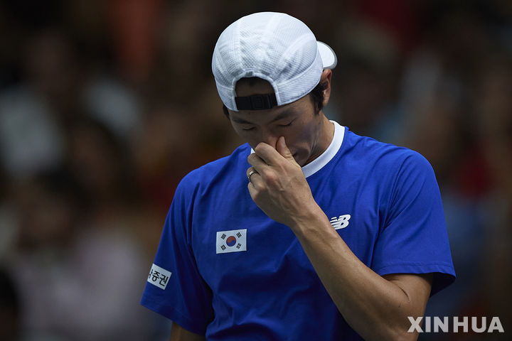 [발렌시아=신화/뉴시스] 홍성찬(194위)이 17일(현지시각) 스페인 발렌시아에서 열린 2023 데이비스컵 파이널 조별리그 C조 3차전 스페인과의 1단식 베르나베 미라예스(75위)와 경기하고 있다. 홍성찬은 0-2(4-6 5-7)로 패하고 2단식의 권순우(112위)도 알레한드로 다비도비치 포키나(25위)에게  0-2(4-6 4-6)로 무릎을 꿇었다. 한국은 복식에서는 승리해 스페인에 1-2로 패하며 조별리그를 3전 전패로 마무리했다. 2023.09.18.