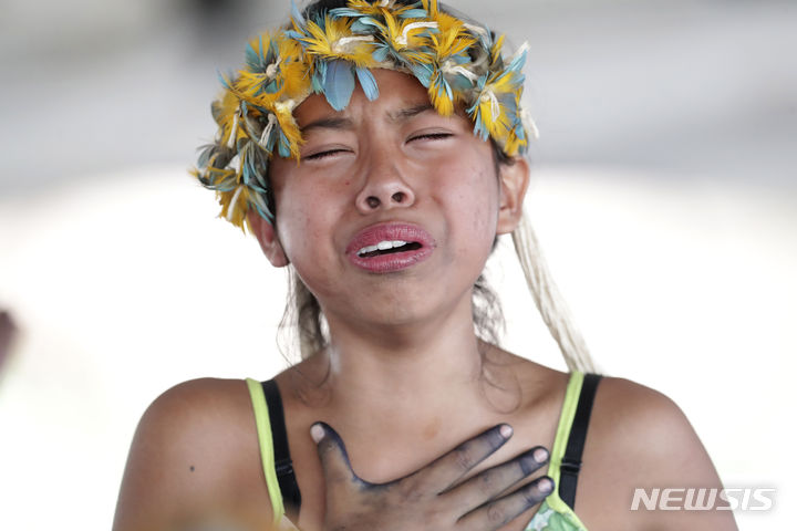 [브라질리아=AP/뉴시스] 21일(현지시각) 브라질 수도 브라질리아의 연방대법원 앞에서 한 원주민 여성이 원주민 토지 연고권을 인정한 법원의 결정에 기쁨의 눈물을 흘리고 있다. 브라질 연방대법원은 그동안 쟁점이 됐던 원주민들의 토지 연고 권한을 인정했다. 2023.09.22.