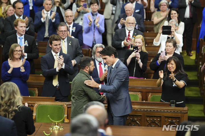 [오타와=AP/뉴시스] 볼로디미르 젤렌스키(왼쪽) 우크라이나 대통령이 22일(현지시각) 캐나다 오타와 의회에서 연설에 앞서 쥐스탱 트뤼도 캐나다 총리와 인사하고 있다. 2023.09.23.