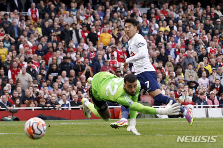 [런던=AP/뉴시스] 토트넘 홋스퍼의 손흥민이 24일(현지시각) 영국 런던의 에미리츠 스타디움에서 열린 2023~24시즌 잉글랜드 프리미어리그(EPL) 6라운드 아스널과의 경기 후반 10분 팀의 두 번째 골을 넣고 있다. 손흥민은 전반 42분에도 득점해 멀티 골을 기록하며 후반 34분 교체됐고 경기는 2-2로 비겼다. 2023.09.25.