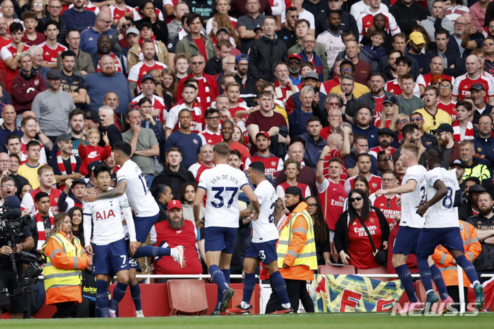 [런던=AP/뉴시스] 토트넘 홋스퍼의 손흥민이 24일(현지시각) 영국 런던의 에미리츠 스타디움에서 열린 2023~24시즌 잉글랜드 프리미어리그(EPL) 6라운드 아스널과의 경기 전반 42분 동점 골을 넣고 동료들과 기뻐하고 있다. 손흥민은 후반 10분에도 득점해 유럽 통산 199골을 기록하며 후반 교체됐고 경기는 2-2로 비겼다. 2023.09.25.