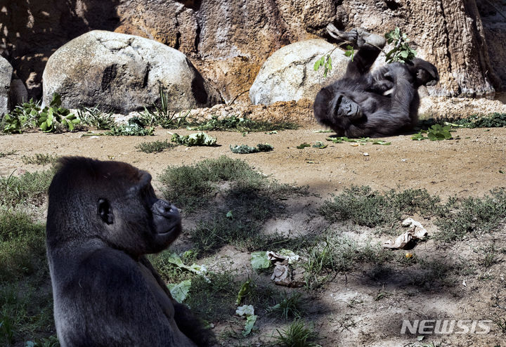 [로스앤젤레스=AP/뉴시스] 세계 고릴라의 날인 24일(현지시각) 미 캘리포니아주 로스앤젤레스 동물원에서 웨스턴로랜드 고릴라 켈리(36, 왼쪽)가 간식을 먹으며 놀고 있는 새끼 앤젤라(4)를 지켜보고 있다. 세계 고릴라의 날은 밀렵과 서식지 파괴로 멸종 위기에 처한 고릴라 보호와 보전을 위해 2017년 고릴라 연구학자 ‘다이앤 포시’의 고릴라 연구 센터 설립을 기념하며 지정한 날이다. 2023.09.25.