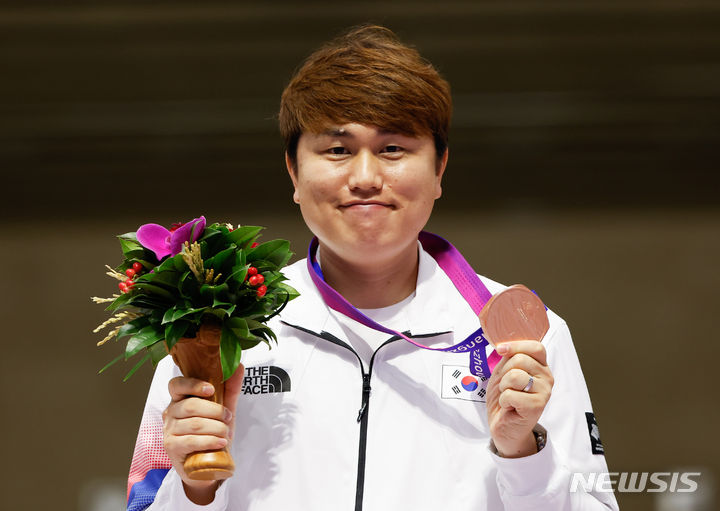 [항저우=뉴시스] 정병혁 기자 = 26일 중국 항저우 푸양 인후 스포츠센터에서 열린 2022 항저우 아시안게임 남자 10m 러닝타깃 혼합 개인 시상식에서 동메달을 차지한 정유진이 메달을 목에 걸고 있다. 2023.09.26. [email protected]