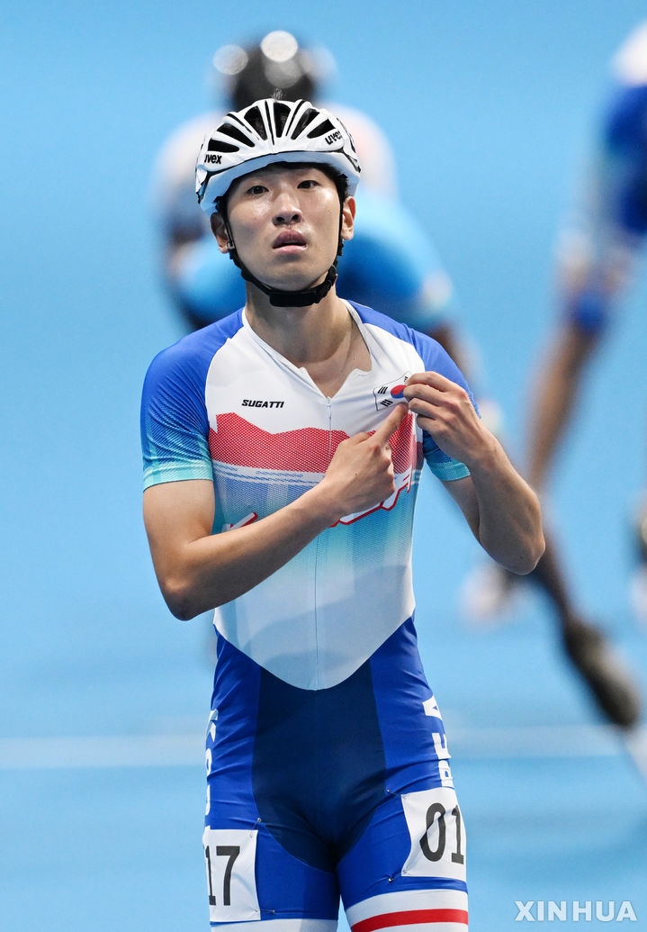 [항저우=신화/뉴시스] 한국 정병희가 30일 중국 항저우 첸탕 롤러스포츠센터에서 열린 2022 항저우 아시안 게임남자 스피드 롤러스케이팅 10000m 포인트 제외(EP) 레이스 결승에서 금메달을 차지한 뒤 태극기를 가리키며 기뻐하고 있다. 2023.09.30