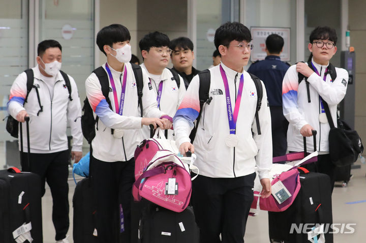 [인천공항=뉴시스] 권창회 기자 = 2022 항저우 아시안게임에서 은메달을 딴 배틀그라운드 모바일 한국대표팀 선수들이 2일 오후 인천국제공항 제2여객터미널을 통해 귀국하고 있다. 2023.10.02. [email protected]