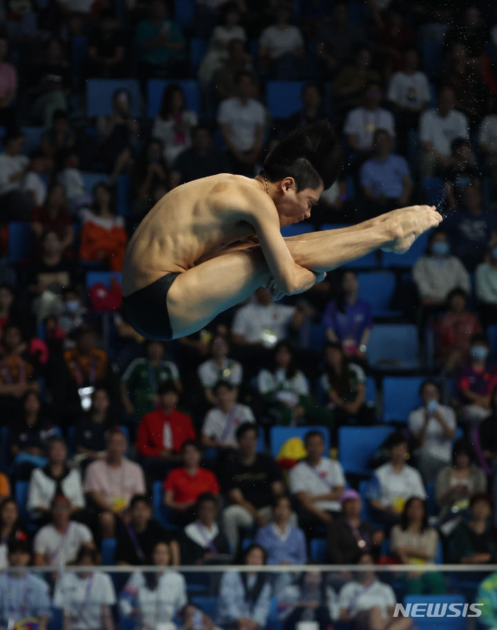 [항저우=뉴시스] 조수정 기자 = 3일 중국 항저우 올림픽스포츠센터 아쿠아틱스포츠아레나에서 열린 2022 항저우 아시안게임 다이빙 3m 스프링보드 남자 개인 결승 이재경이 연기를 펼치고 있다. 2023.10.03. [email protected]