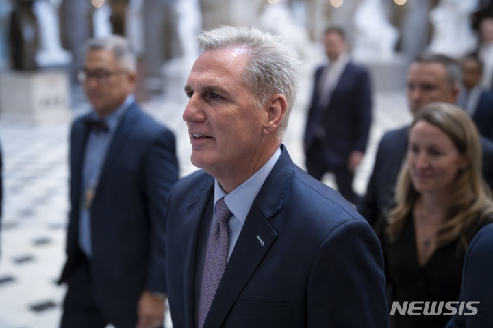 [워싱턴=AP/뉴시스] 케빈 매카시 미 하원의장이 3일(현지시각) 하원의장에서 해임된 후 의사당을 나서고 있다. 미국 권력 서열 3위에 해당하는 하원의장이 미 헌정사상 처음으로 구성원들에 의해 해임됐다. 2023.10.04.