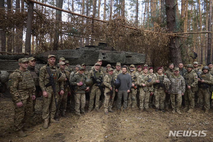 [하르키우=AP/뉴시스] 우크라이나 대통령 공보실이 제공한 사진에 볼로디미르 젤렌스키 우크라이나 대통령(가운데)이 3일(현지시각) 우크라이나 하르키우주 전선을 방문, 레오파르트2 전차 앞에서 우크라이나 군인들과 사진 촬영을 하고 있다. 2023.10.04.