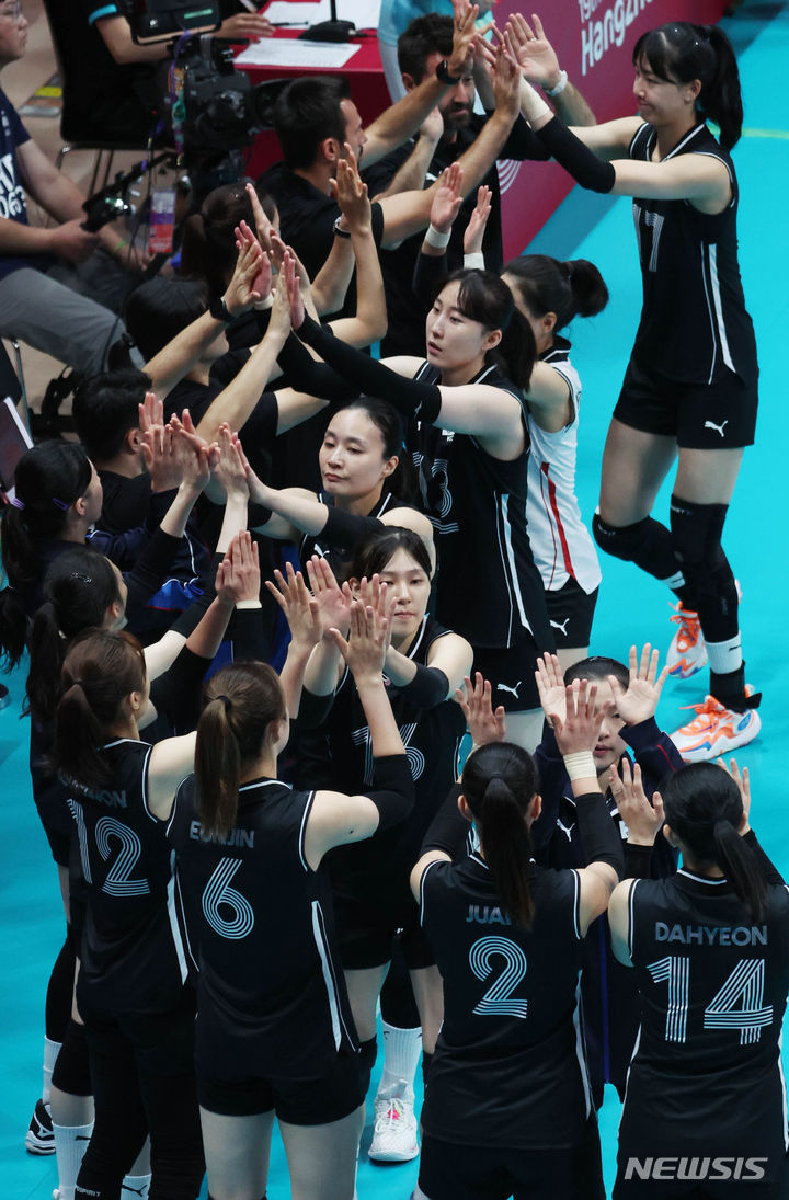 [항저우=뉴시스] 조수정 기자 = 4일 중국 저장성 항저우 사범대 창첸캠퍼스경기장에서 열린 2022 항저우 아시안게임 여자배구 8강 라운드 E조 첫 경기 한국 대 중국, 한국 선수들이 중국에 세트 스코어 0-3(12-25 21-25 16-25)으로 패배한 뒤 굳은 표정으로 서로를 격려하고 있다. 한국은 이날 중국에 패배하며 4강 진출에 실패했다. 2023.10.04. [email protected]