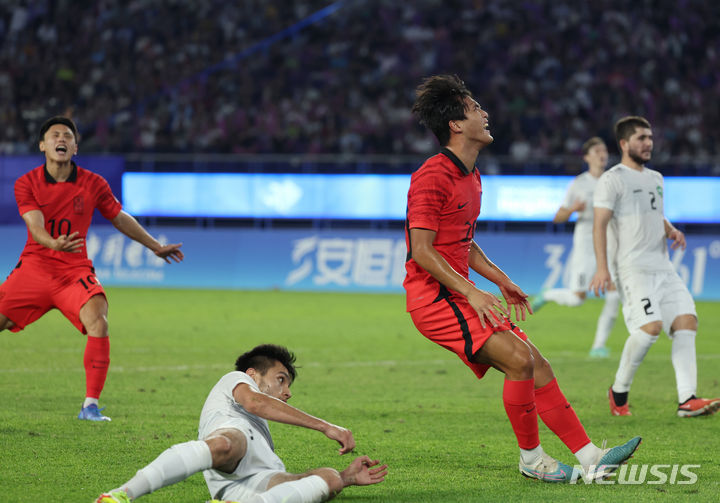 [항저우=뉴시스] 고승민 기자 = 4일 중국 항저우 황룽스포츠센터 스타디움에서 열린 2022 항저우 아시안게임 남자 축구 준결승 한국 대 우즈베키스탄 경기, 후반전 한국 안재준이 슛 실패 후 아쉬워하고 있다. 2023.10.04. [email protected]