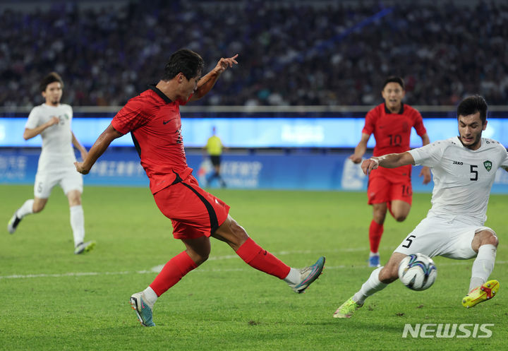 [항저우=뉴시스] 고승민 기자 = 4일 중국 항저우 황룽스포츠센터 스타디움에서 열린 2022 항저우 아시안게임 남자 축구 준결승 한국 대 우즈베키스탄 경기, 한국 안재준이 슛을 시도하고 있다. 2023.10.04. [email protected]