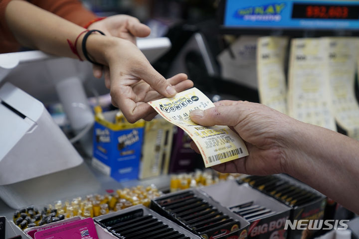 [파인빌=AP/뉴시스] 4일(현지시각) 미 노스캐롤라이나주 파인빌의 한 담뱃가게 주인이 손님에게 파워볼 복권을 팔고 있다. 지난 11주간 당첨자가 나오지 않아 파워볼의 누적 당첨금이 역대 세 번째로 큰 액수인 12억 달러(약 1조6200억 원)로 늘어났다. 파워볼의 1등 당첨 확률은 약 2억9220만 분의 1이다. 2023.10.05.
